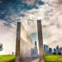 Stunning reflection memorial with New York City skyline in the background under a dynamic sky.